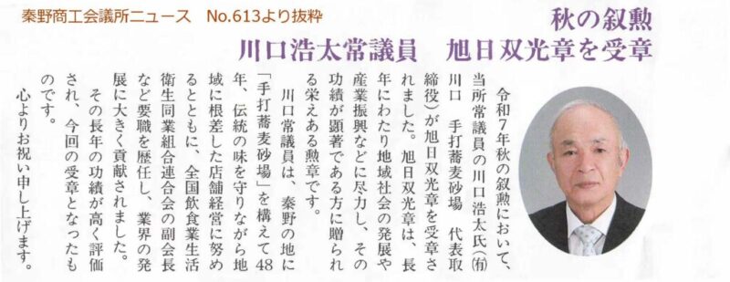 川口組合長 旭日双光章を受章されました(令和7年秋の叙勲)