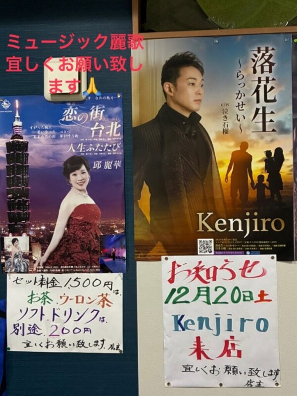 ミュージック 麗歌 Twitter Facebook はてブ LINE 2025.11.12 2025.10.25 当店はミュージック麗歌、昼カラ喫茶です 歌好きの人が気さくに来れるお店です 時折プロ歌手が新曲キャンペーンに来店いたします 料金は一日歌い放題で1,500円(ドリンク及びお菓子付き)です ミュージック麗歌スナック エリア 渋沢駅エリア 住所秦野市堀川123-19 電話番号0463-20-8223 定休日月曜日 営業時間昼カラ 11:30~16:30 夜カラ 17:30~21:30 (夜予約制4名~) 駐車場有り ホーム・ページ お料理ご案内